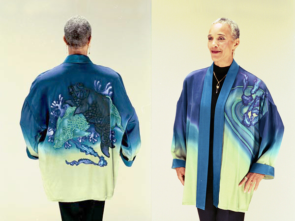 Traditional Japanese screen print style imagery is adapted to the jacket form.