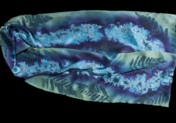 Thicken dye is sponged on the silk in an undulating flow punctuated by fern branches dipped in subtly glittering metallic pigment. The silk side is hand painted and printed using actual fern branches. Velvet side is custom dyed midnight blue to match. Combining beauty and practicality, this muffler is extremely warm and comforting when worn in contact with the skin.
