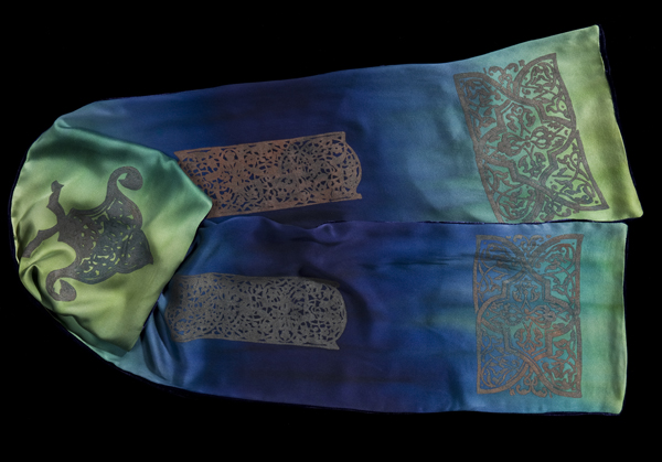 Intricate Persian metalwork informed this design. Silk side is hand painted and printed. Velvet side is custom dyed midnight blue to match. Combining beauty and practicality, this muffler is extremely warm and comforting when worn in contact with the skin.