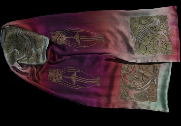 Although many of my designs are adapted from the Arts and Crafts period, this combination was so quintessentially so that no other name could apply. Silk side is hand painted and printed. Velvet side is solid black. Combining beauty and practicality, this muffler is extremely warm and comforting when worn in contact with the skin.