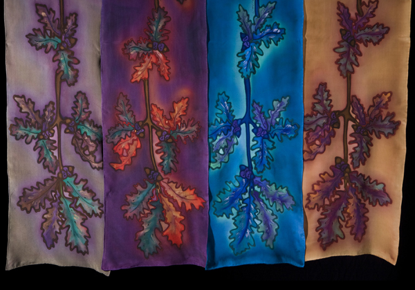 Luxurious, flowing silk hand painted by the artist in rich jewel tones makes of each scarf a collectible piece of wearable art.