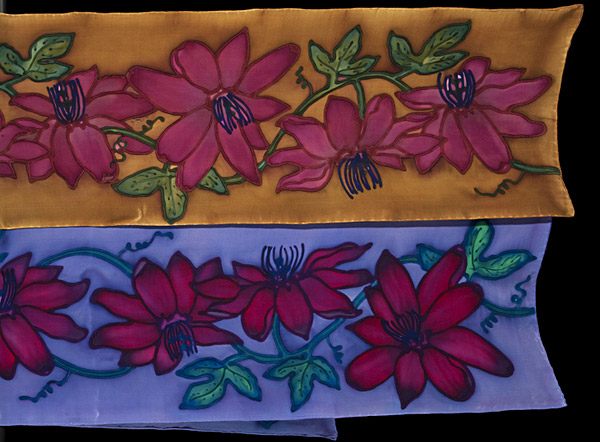 Luxurious, flowing silk hand painted by the artist in rich jewel tones makes of each scarf a collectible piece of wearable art.