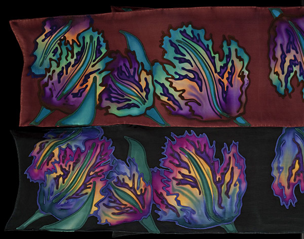 Luxurious, flowing silk hand painted by the artist in rich jewel tones makes of each scarf a collectible piece of wearable art.