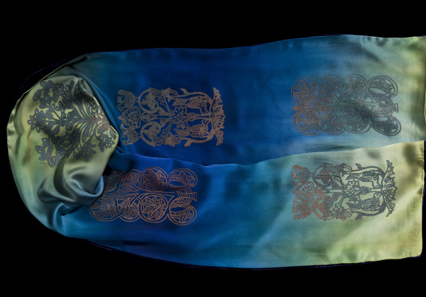 Images carved in stone relief from a church in Venice, Italy take on a new life in this piece. Silk side is hand painted and printed. Velvet side is custom dyed midnight blue to match. Combining beauty and practicality, this muffler is extremely warm and comforting when worn in contact with the skin.